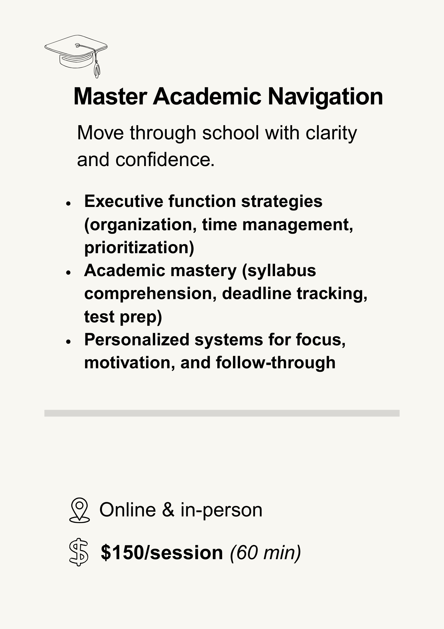 Available in-person and online. Whether you're a teen struggling with focus or a parent supporting your child's success, I offer a pathway that blends education, wellness, and accountability into a system that works.